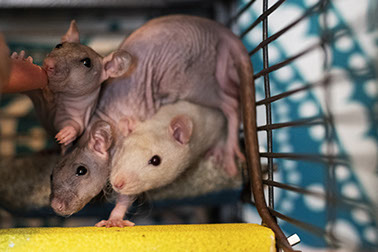All breeders and pet mills (where the animals get purchased from, in order to come to the pet store) are mass-breeding facilities, that crowd many animals into barren cages, with little regard for their welfare. The breeding fancy rats females at these farms are forced into lives of confinement, only to be destroyed or discarded, when they can no longer churn out cute young ones.