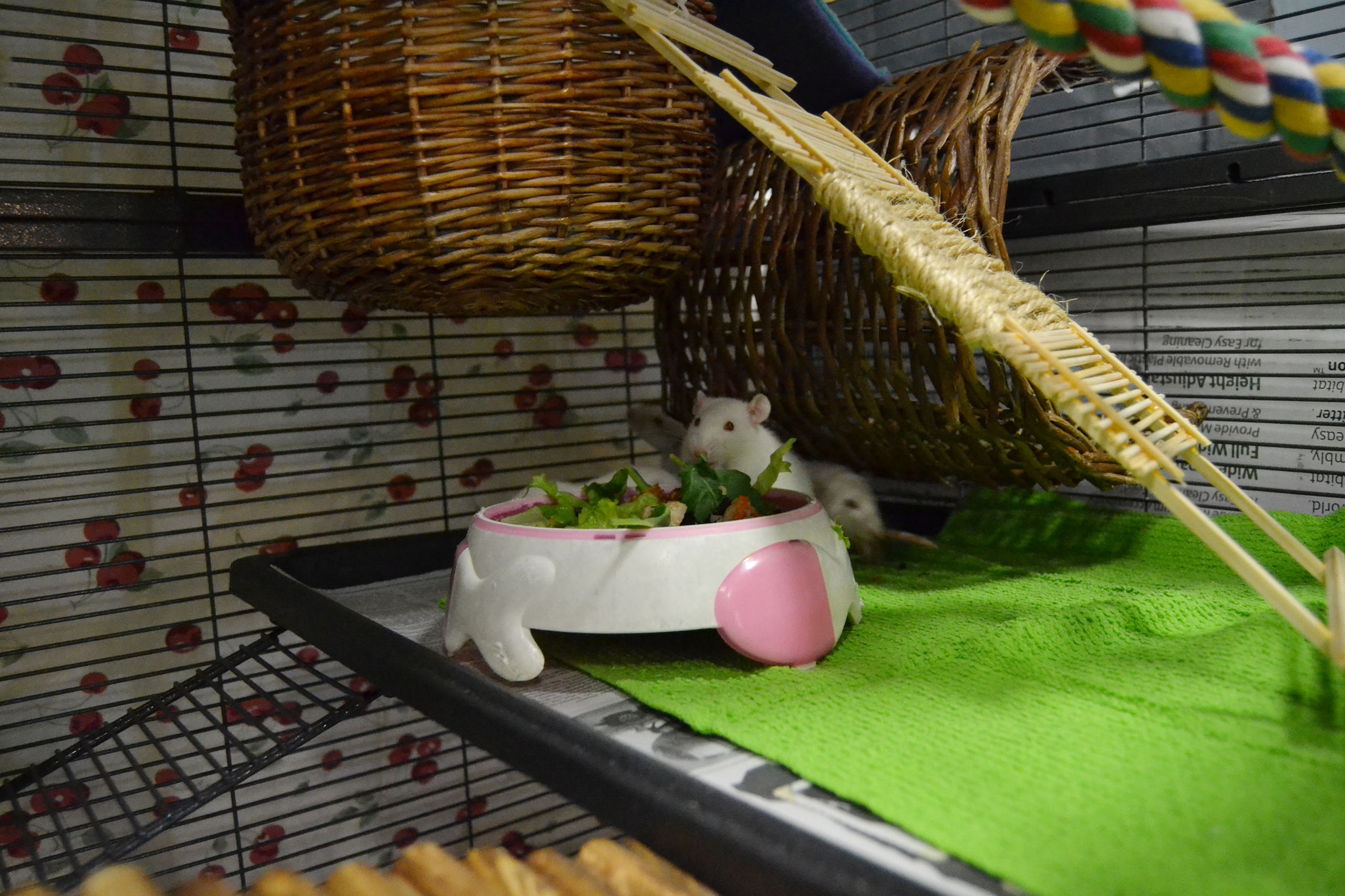 While we know many rat guardians that do scheduled cleaning every 2-3 weeks, when everything has to be taken apart and cleaned, we often see those cages to be messy, with sticky sides, and unkempt bottom edges in the meantime, and sometimes even after the clean as the build up gets too much to control. We recommend daily upkeep (or at least every other day!) with a cleansing solution of white vinegar and water (just fill a spray bottle with half and half) for the flat cage levels, and disinfecting wipes for the cage bars. This way the cleaning part literally takes a few minutes, as opposed to hours needed to spend on scrubbing and brushing, if it was being done every few weeks. The daily cleaned cage will always be safer for the animals inhabiting it, more presentable, and would allow you to better monitor their bathroom habits, making it possible to notice any subtle changes. This knowledge will greatly assist you in maintaining their health, and inform you of any concerns, or complications on the horizon.