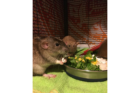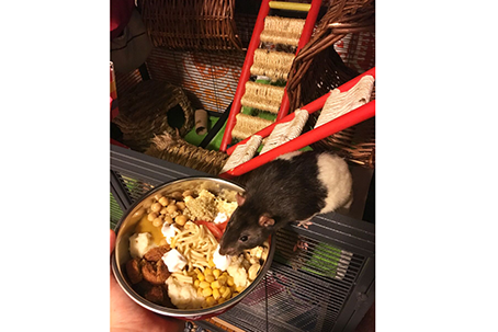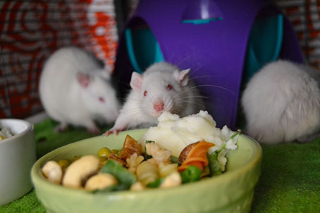 The ratties’ primary food source should be a good lab block/pelleted food (such as Oxbow Rat food), supplemented with daily cooked and fresh veggies, legumes, beans, rice, pasta, leafy greens, and occasional fruits. We believe that VEGAN DIET is not only morally consistent for us, and our fellow omnivores, but also vital for rats’ wellbeing and overall health. Today animal derived foods are too stained with hormones, pesticides, antibiotics and steroids (see our Vegan For the Animals pages for more info!) and are to be avoided all together. Even if not harmful due to many additives and chemical preservatives (that are impossible to avoid), animal derived foods are simply not a necessity. Well planned vegan diets are nutritionally adequate and may provide health benefits in the prevention and treatment of certain rat diseases (such as tumors and cancer).
